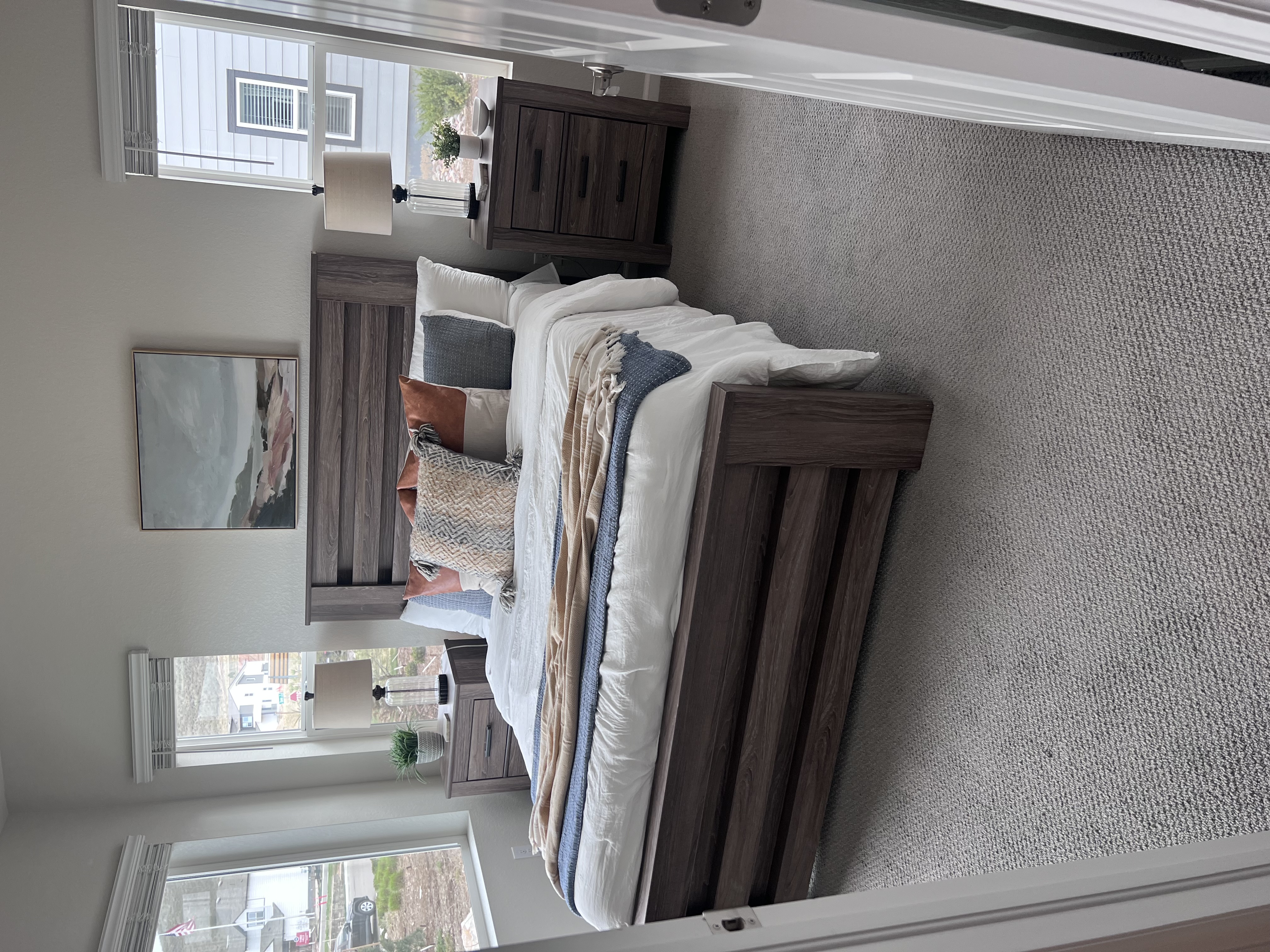 Located on the ground floor, this is the most private space in the home. It includes a queen bed, nightstands, shelving, excellent natural light, and a private en-suite bathroom. Ideal for someone who values privacy and a quiet retreat.